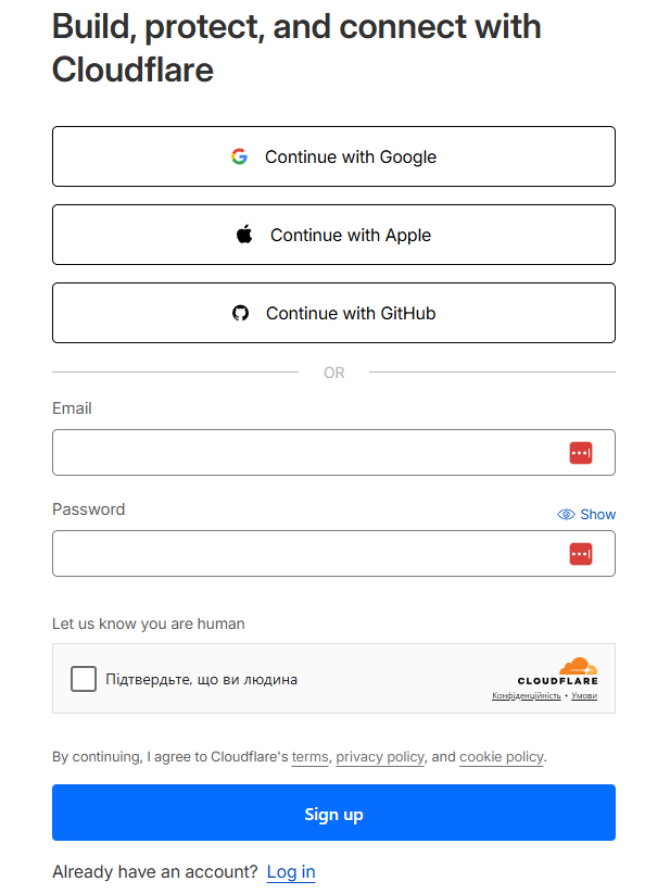 Перейдіть за прямим посиланням на реєстрацію: 👉 https://dash.cloudflare.com/sign-up