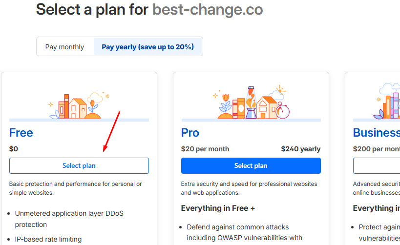 Прокрутіть сторінку вниз до вибору тарифу. Оберіть план Free (Безкоштовний) — цього достатньо для повноцінної роботи. Натисніть Select plan.