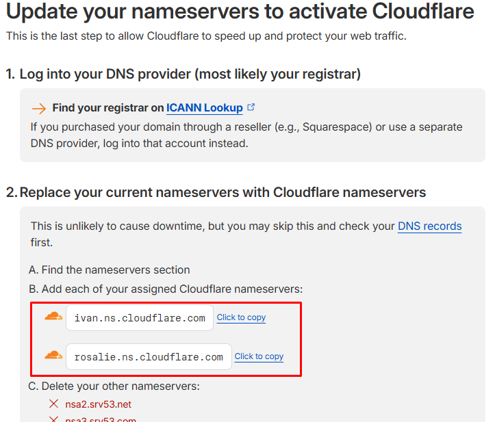 Замініть поточні сервери на ті, що видав вам Cloudflare.